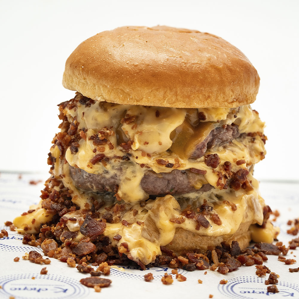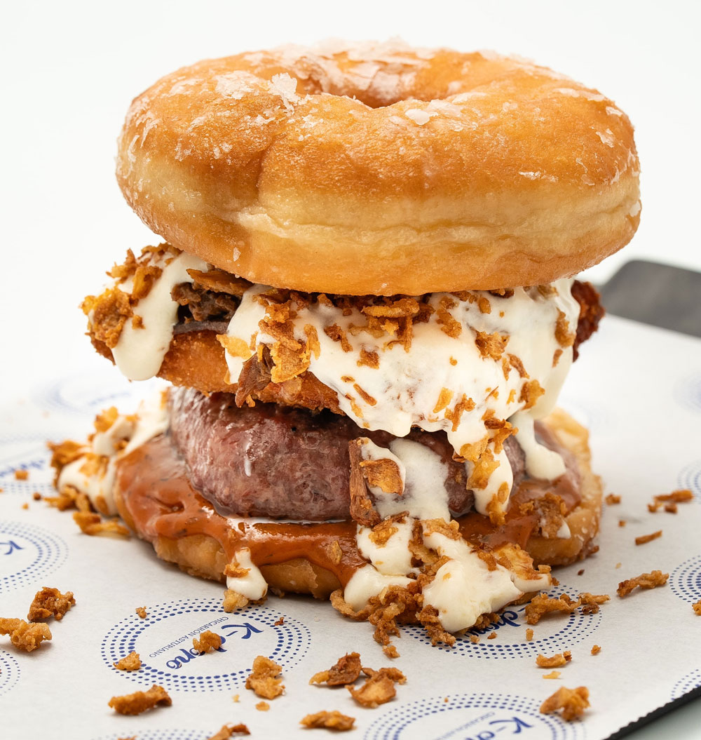 Pan de donut casero, salsa ranchera, doble patty de 125g, queso cheddar, pulled pork, salsa Camembert y cebolla frita